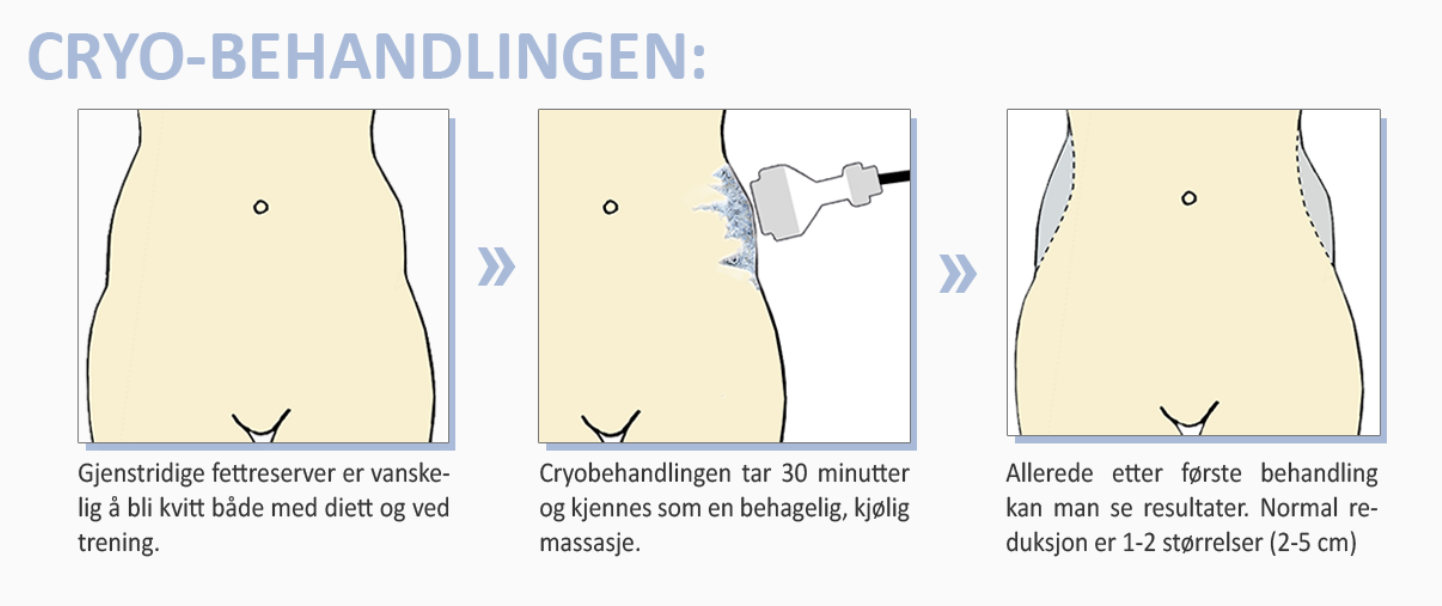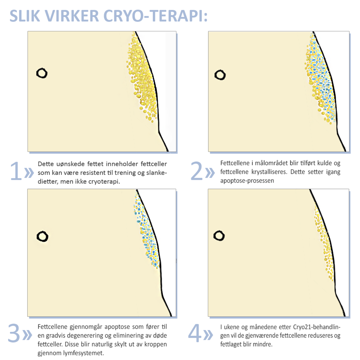 Cryoterapi er den mest innovative, ikke-kirurgiske behandlingen for lokalisert fettreduksjon, cellulittutjevning og oppstramming som er tilgjengelig på markedet i dag. Det er en moderne variant av fettfrysing som hjelper til med å fjerne "grevinneheng", dobbelthake, magefett, cellulitter osv.